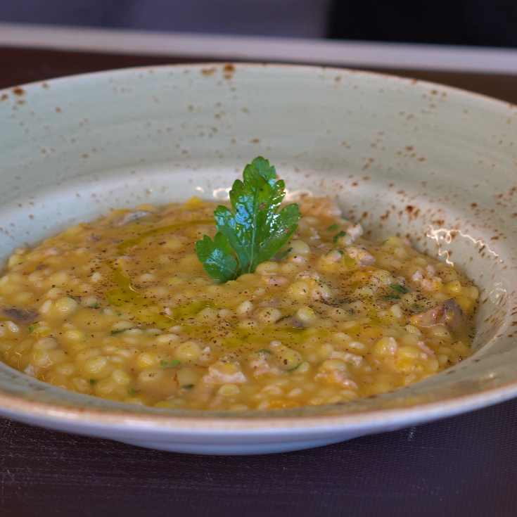 01 – На разогретой сковородке с оливковым маслом обжариваем зубчик чеснока. После этого добавляем тыкву, нарезанную мелкими кусочками, купаты, грибы и добавляем маленькую веточку розмарина. После добавления этих ингредиентов чеснок из сковородки можно убирать.